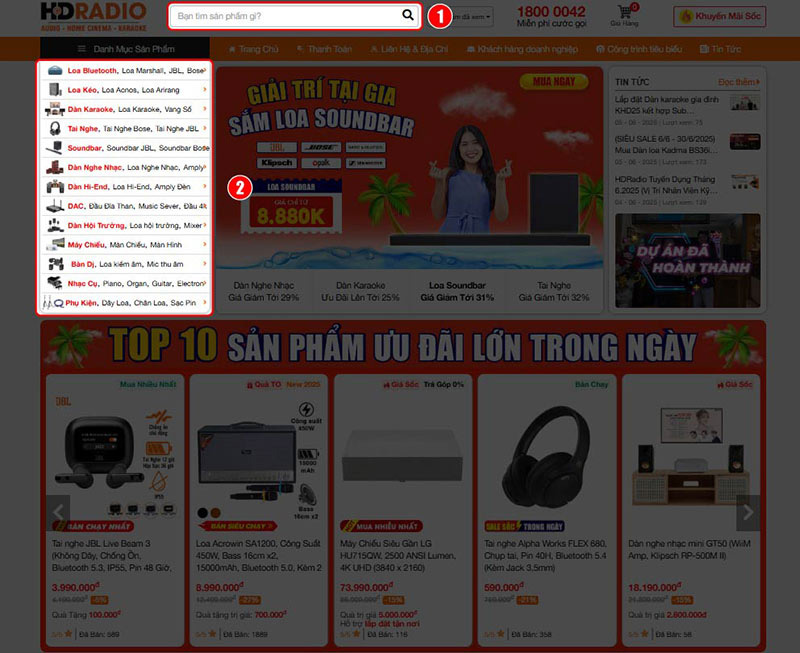 - Số 2 : Tìm sản phẩm trực tiếp thông qua các danh mục của HDRADIO