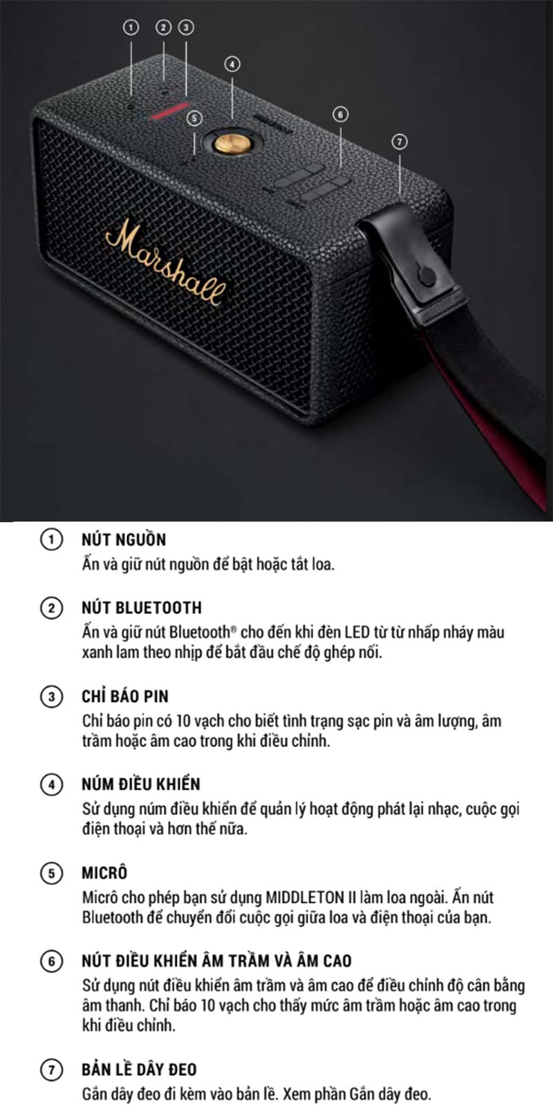 Để cài đặt loa marshall Willen, loa marshall Middleton các bạn giữ nút Bluetooth trong 7s