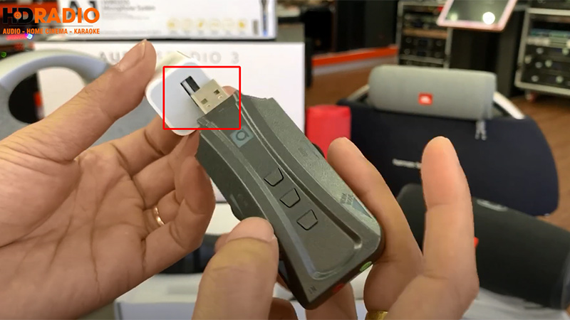Cắm đầu USB của chiếc đầu thu phát micro vào đầu sạc điện thoại thông minh (rồi cắm tiếp hệ thống vào nguồn điện) hoặc cắm vào Sạc dự phòng (rồi bật sạc dự phòng)