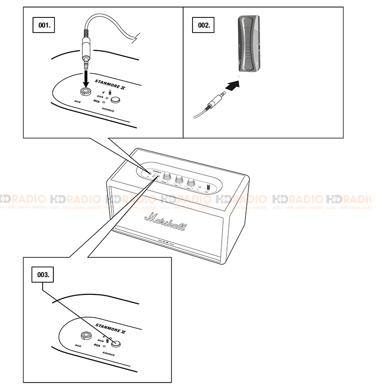 Kết nối đầu thu phát micro với loa marshall thông qua dây 3,5mm đi kèm của bộ micro sau đó chuyển chế độ kết nối của loa marshall sang AUX