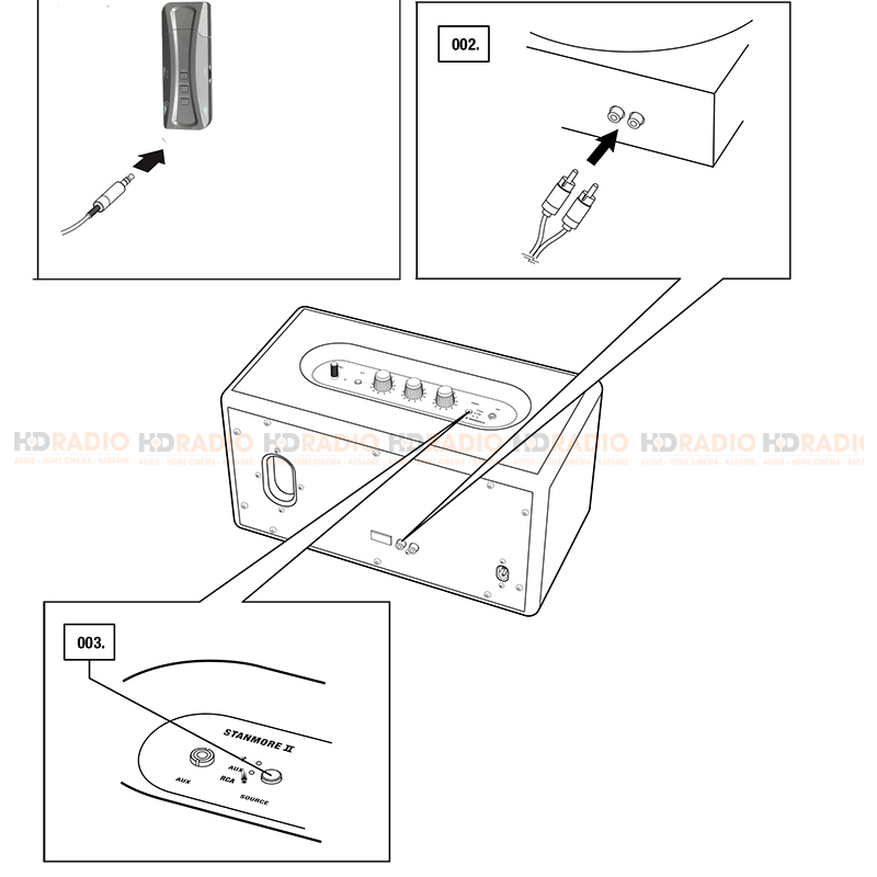 Sử dụng dây có một đầu 3,5 mm một đầu ra AV nếu bạn muốn hát karaoke từ cổng RCA (Kết nối đầu thu phát micro với công 3,5mm, kết nối đầu AV còn lại vào cổng RCA trên loa marshall) sau đó chuyển chế độ kết nối của loa marshall sang RCA.