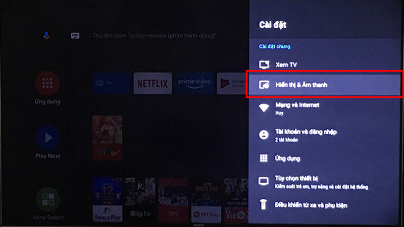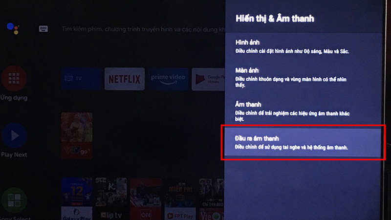 Bước 3: Mở Tivi >>> vào cài đặt >>> hiển thị và âm thanh >>> chọn đầu ra âm thanh >>> chọn đầu ra bluetooth