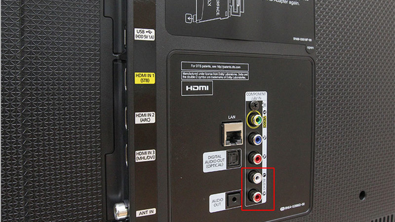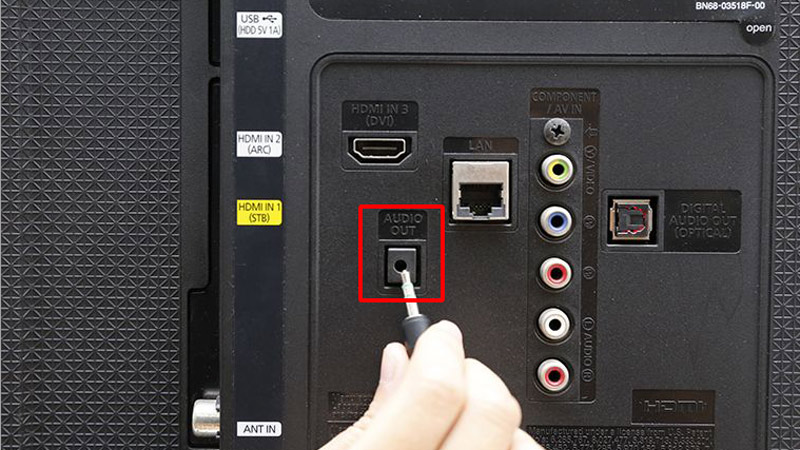 Bước 2: Cắm đầu dây 3,5 còn lại vào cổng có ký hiệu AUDIO OUT trên Tivi