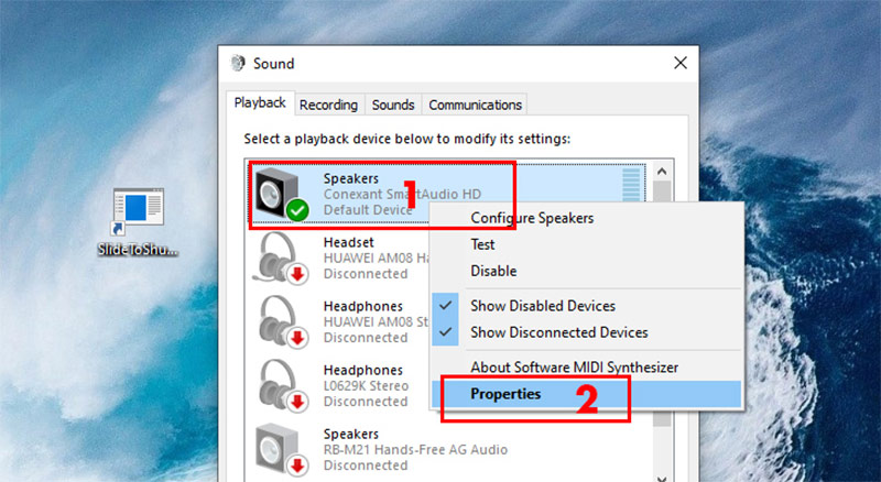 Bước 2: Tại hộp thoại Sound, chọn Playback > Click chuột phải vào tên thiết bị tai nghe > Chọn Properties.