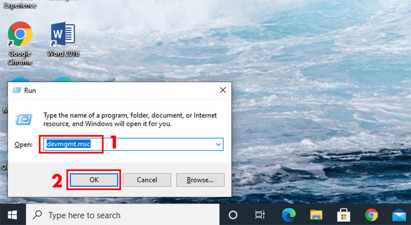 Bước 1: Nhấn tổ hợp phím Windows + R > Nhập devmgmt.msc > Bấm OK.