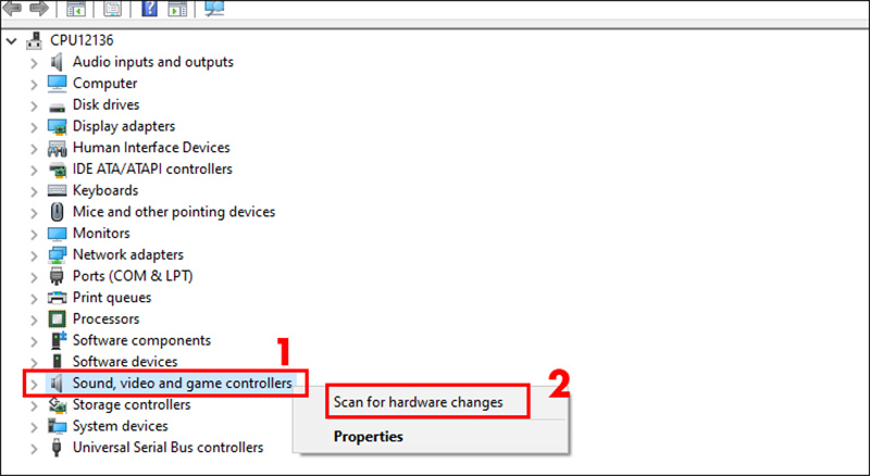 Bước 4: Nhấn chuột phải vào Sound, video and game controllers > Chọn Scan for hardware changes