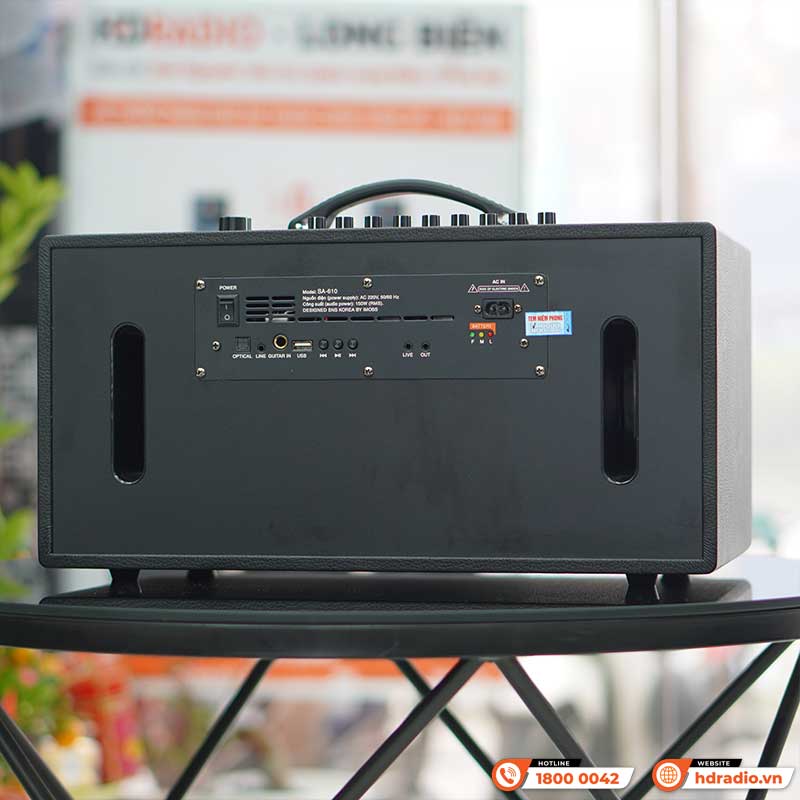 Trong khi đó, mặt sau Acrowin SA610 là nơi bố trí các cổng kết nối và nút điều chỉnh thân thiện với người dùng, giúp thuận tiện phối ghép với các nguồn nhạc khác cũng như không làm mất đi tính thẩm mỹ vốn có của nó. Hoàn thiện thùng loa là một lớp da tổng hợp cao cấp mang đến vẻ đẹp đầy lịch lãm.