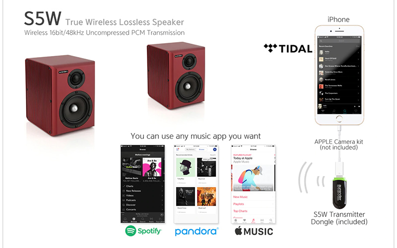 Bạn có thể sử dụng iPad, iPhone / điện thoại Android để phát nhạc của riêng mình hoặc bất kỳ dịch vụ phát nhạc trực tuyến nào bạn muốn. Sau đó, bạn có thể thưởng thức âm nhạc mà bạn phát từ thiết bị của mình với chất lượng âm thanh HiFi thực sự thông qua S5W. Và không cần ghép nối, không cần cài đặt phần mềm - chỉ cần cắm thiết bị truyền tín hiệu đi kèm vào thiết bị bạn chọn, chọn nhạc và nhấn phát. Âm nhạc sau đó được chuyển hướng tự động đến S5W!