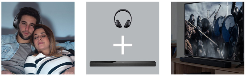 Bạn muốn xem Tivi nhưng không muốn ảnh hưởng người khác? Với công nghệ Bose SimpleSync, bạn có thể thực hiện điều đó cực kỳ dễ dàng. Kết nối Tai nghe khử tiếng ồn Bose Headphones 700 với Loa Bose Soundbar 500 để tận hưởng trải nghiệm xem TV cá nhân. Với các nút điều khiển âm lượng độc lập, bạn có thể tăng giảm hoặc tắt tiếng loa soundbar mà vẫn giữ nguyên âm lượng của tai nghe theo ý thích.