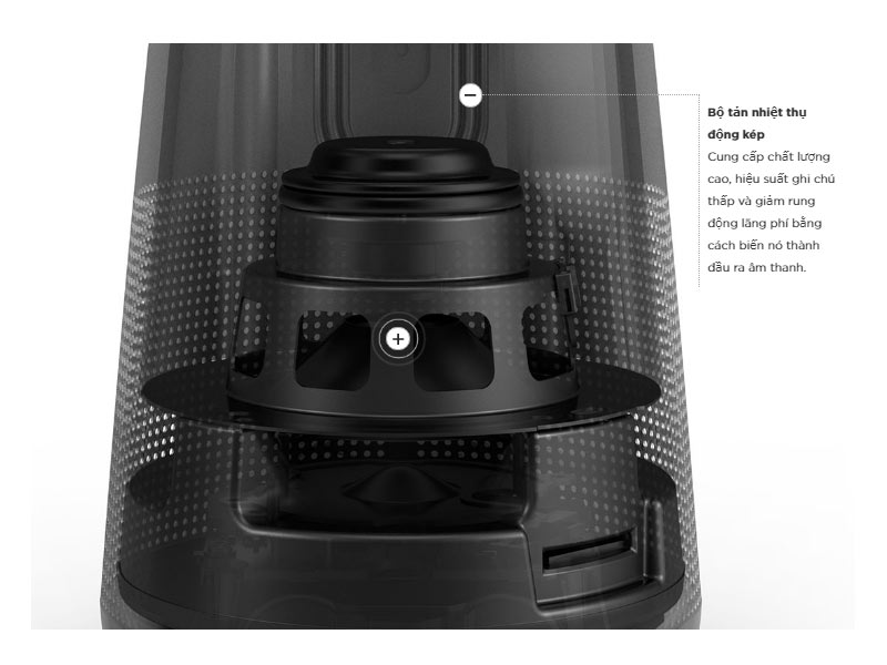 Bộ tản nhiệt kép thụ động và thiết làm dàn trải âm thanh giúp âm thanh trải 360 độ ấn tượng. Thực sự các bạn sẽ nghe rõ ở mức âm lượng lớn với khoảng cách lớn ở bất kỳ vị trí nào xung quanh loa.