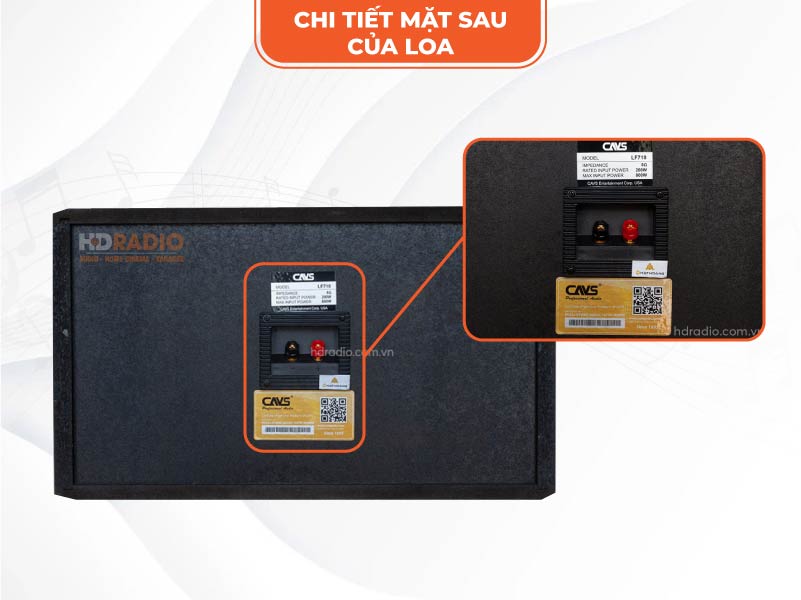 Loa có thiết kế hình khối chữ nhật 3D chính giữa là logo CAVS kim loại mạ vàng sáng bóng nổi bật. Mặt sau của Loa hát karaoke CAVS LF710 là cầu kết nối với dây loa rất chắc chắn và phân cực màu rõ rệt. Các thông số kỹ thuật cũng được sản xuất là CAVS Entertainment Coporation ghi chú rõ ráng, Trên tất cả sản phẩm có tem chính hãng của CAVS và các thông tin theo kèm QR code dẫn tới trang của nhà phân phối chính thức tại Việt Nam, các bạn có thể tự kiểm tra phần này bằng chiếc smartphone của mình.