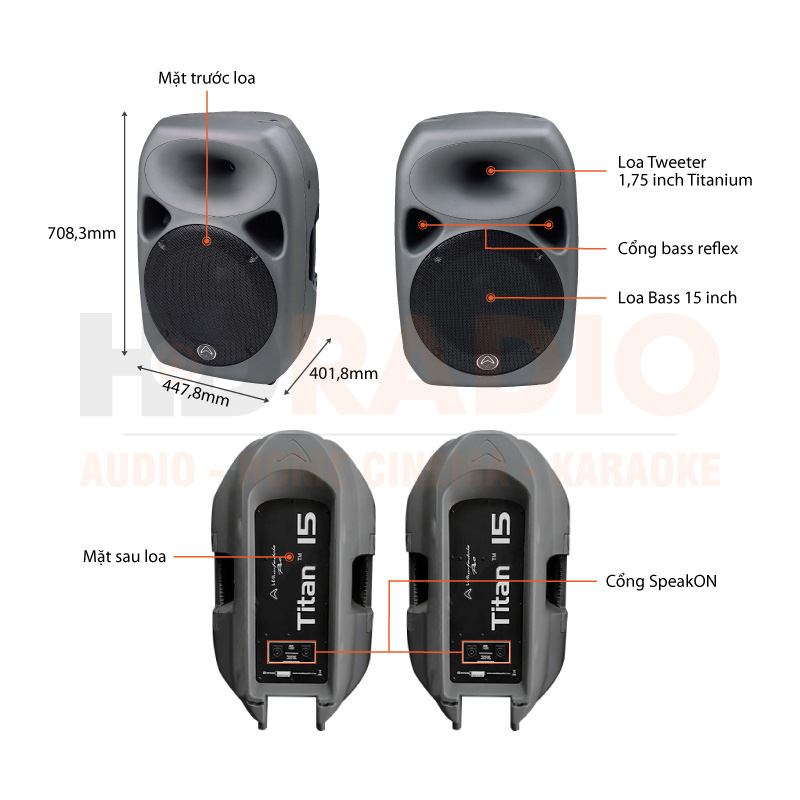 Loa Wharfedale Titan 15 được thiết kế với cấu tạo hai đường tiếng, bao gồm một củ loa bass 15 inch và một loa treble 1.75 inch titanium, mang đến cho bạn trải nghiệm âm thanh hội trường chuyên nghiệp và tuyệt vời nhất.