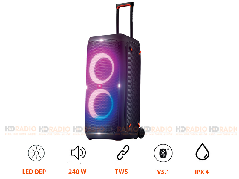 - Âm thanh JBL Pro Sound mạnh mẽ với âm trầm sâu, tối ưu hóa tiếng hát được tái hiện rõ ràng hơn so với phiên bản partybox 300 cũ. Công suất mạnh mẽ lên tới 240W