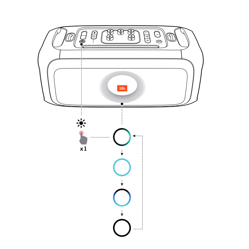 Các kiểu nháy led trên loa bluetoothJBL PartyBox OnThe Go được cài sẵn dễ dàng chuyển đổi kiểu nháy đèn theo sở thích của bạn chỉ với một nút nhấn đơn giản phía trên.