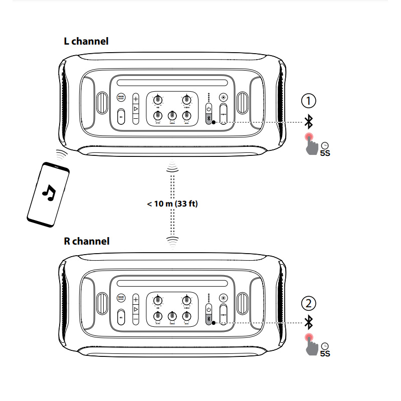 Kết nối 2 loa Loa JBL PartyBox on the go qua công nghệ True Wireless Stereo (TWS) bằng cách đặt gần và giữ nút bluetooth trên cả 2 loa trong 5S