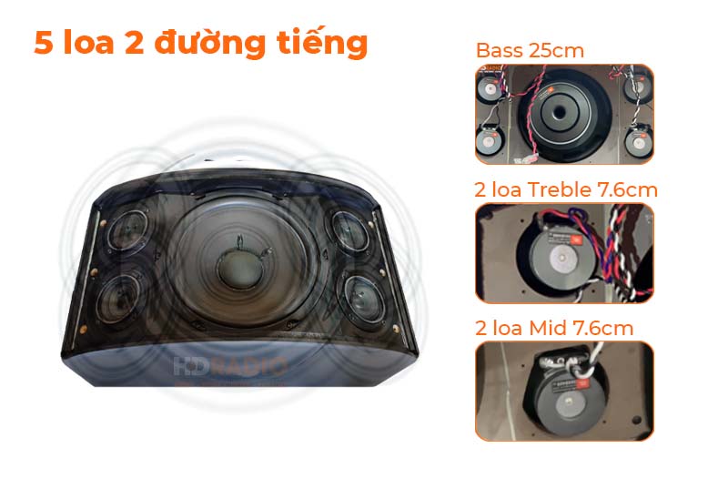 - Thiết kế: 5 Loa , 3 đường tiếng