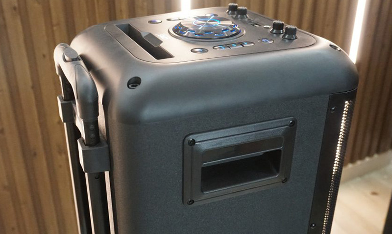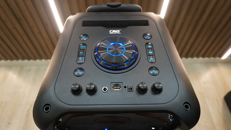 Bên trên loa kéo Cavs K110 được thiết kế một hõm nhỏ cho phép bạn dễ dàng đặt chiếc điện thoại di động hay ipad của mình lên trên cực kỳ đơn giản. Hệ thống bảng điều khiển cũng được trang bị với đầy đủ các nút hiệu chỉnh thông số loa, giúp bạn dễ dàng làm chủ thiết bị của mình chỉ với một vài thao tác bằng tay đơn giản. Mặt sau của loa là hệ thống các cổng kết nối đa dạng bao gồm kết nối Bluetooth, cổng USB, thẻ nhớ SD...Nhà sản xuất cũng trang bị thêm 2 micro không dây, giúp bạn thoải mái ca hát mọi lúc mọi nơi.