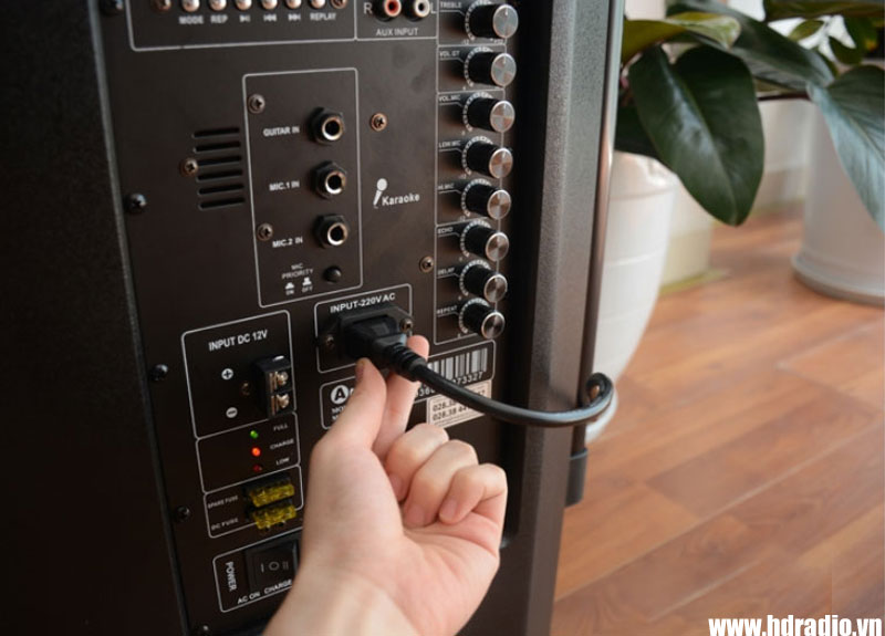Cắm nguồn dây nguồn điện cho loa kéo chắc chắn.