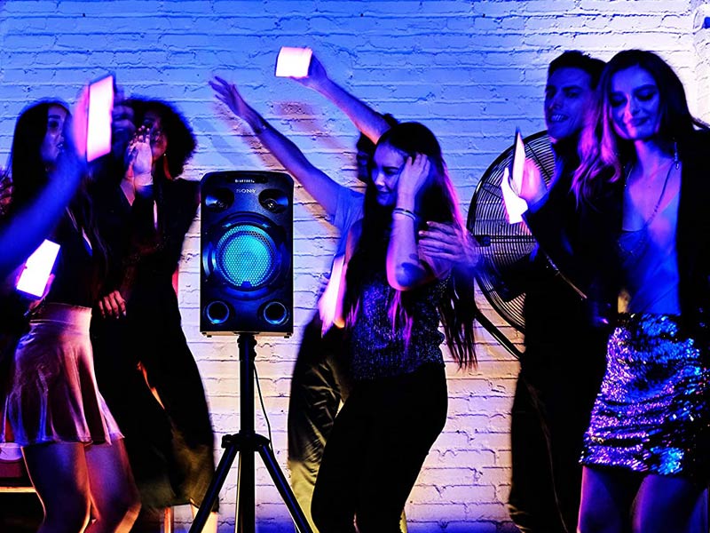 Ngoài ra bạn có thể thưởng thức âm thanh mạnh mẽ hơn bằng cách kết nối loa SONY MHC-V02 nhiều loa SONY cùng công nghệ khác tại nhà qua kết nối Bluetooth®. Kết nối tới 50 hệ thống âm thanh tại nhà tương thích và đồng bộ nhạc cùng ánh sáng.