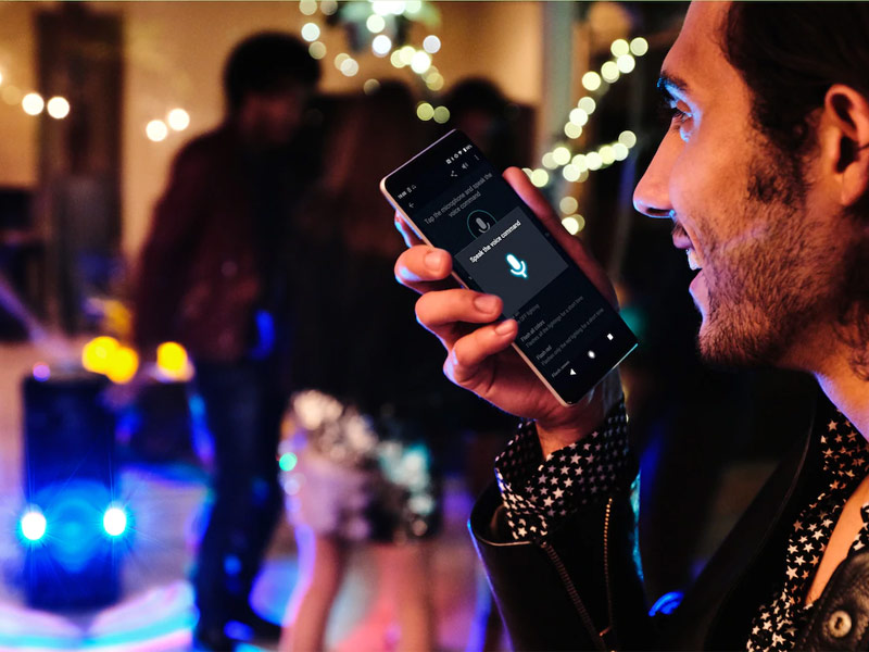 Điều khiển thay đổi bài hát, bật đèn, nhấp nháy tất cả màu đèn chỉ bằng giọng nói dễ dàng. Chỉ cần chọn tính năng Điều khiển bằng giọng nói qua ứng dụng Fiestable và phát lệnh với loa SONY MHC-V42D – có tới 39 câu lệnh bao gồm cả phát nhạc, bật đèn và chế độ KARAOKE.