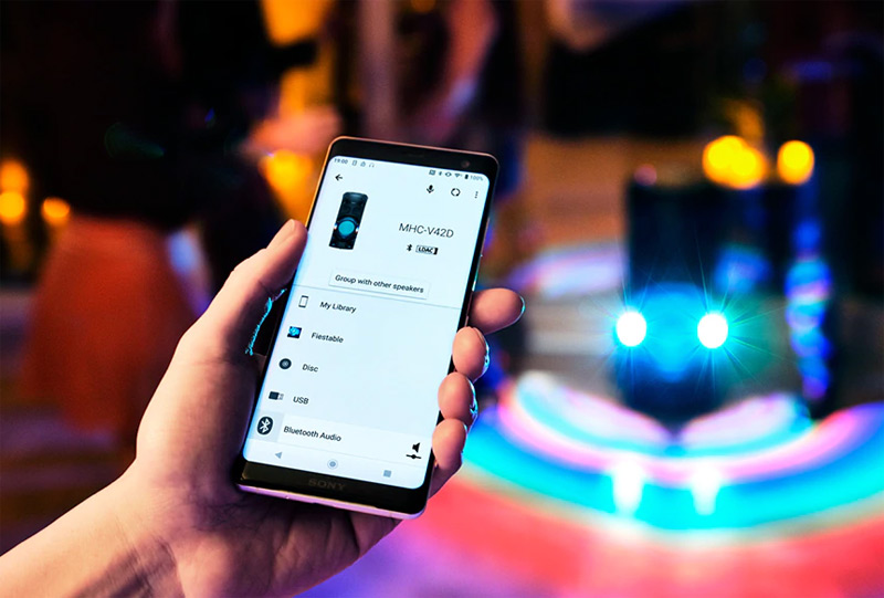 Thông qua app Fiestable, bạn có thể điều khiển loa SONY MHC-V42D bằng giọng nói hoặc bật tắt ánh đèn trên màn hình điện thoại mô phỏng theo hiệu ứng ánh sáng của hệ thống âm thanh cực kì chuẩn xác. Fiestable còn cho phép bạn điều khiển màu đèn cũng như kích hoạt các chế độ DJ và karaoke, thực hiện thay đổi chỉ bằng động tác vẫy cổ tay nhờ tính năng điều khiển chuyển động trực quan.