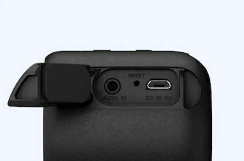 Ngoài ra, bên phải loa là gioăng cao su bảo vệ cổng sạc Micro USB, cổng AUX và lỗ reset, giúp loa có khả năng chống nước IPX5 cực kỳ ấn tượng.