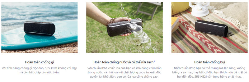 Loa bluetooth không dây Sony SRS XB21 được trang bị tính năng chống nước, chống bụi và chống gỉ vô cùng độc đáo, giúp mang lại độ bền cao, đồng thời giúp bạn thoải mái sử dụng ở bất kỳ ở đâu hay thời tiết nào. Dù có bị bụi đến đâu hay nước bắn vào thì cũng không hề phải lo lắng về chất lượng âm thanh của loa, bạn có thể yên tâm cho những bữa tiệc tại biển, hồ bơi của mình. Đồng thời, chiếc loa của bạn có khả năng chìm hẳn trong nước, và nhờ loại vải chất lượng cao sản xuất độc quyền tại Nhật Bản, bạn có rửa loa cũng chẳng sao.