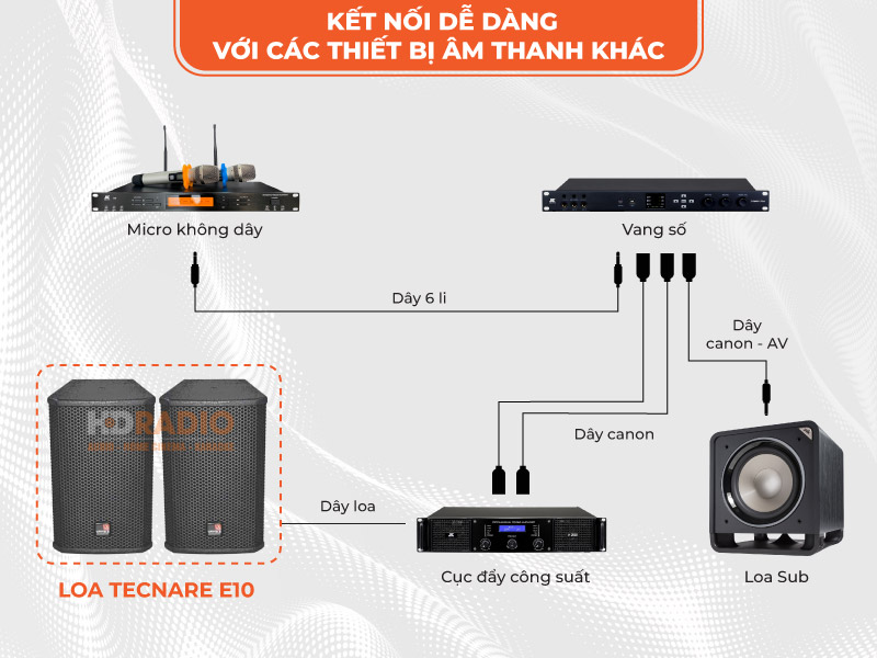 Loa Tecnare E10 được sử dụng nhiều trong thực tế với khả năng ghép nối đa dạng, được sử dụng chuyên biệt cho hệ thống dàn karaoke chuyên nghiệp, cafe phòng trà cao cấp hệ thống phòng hát cao cấp.