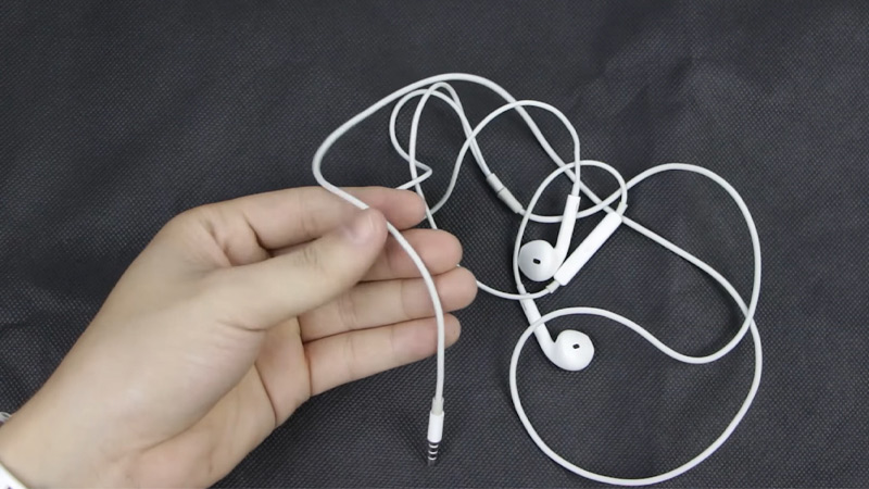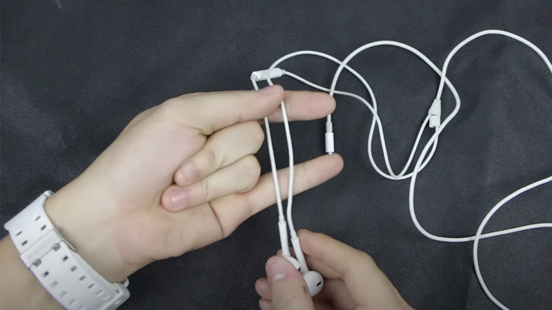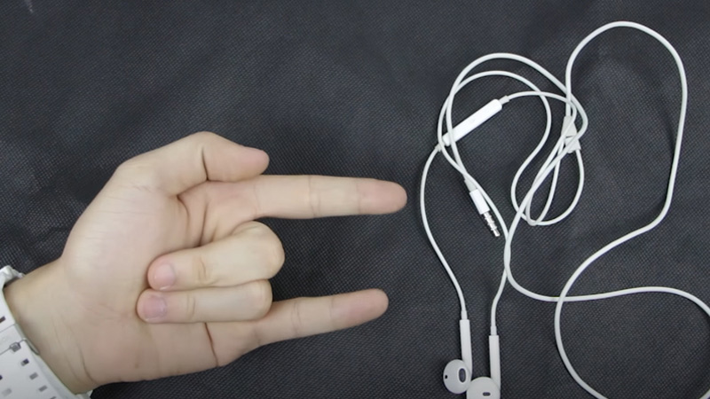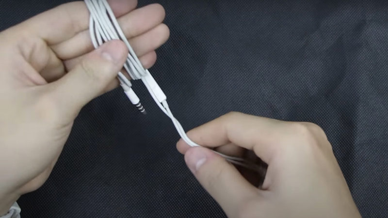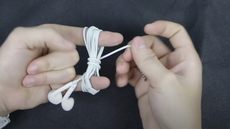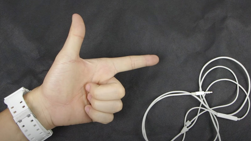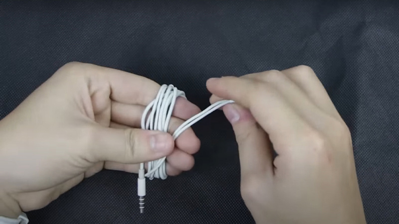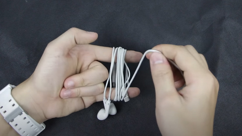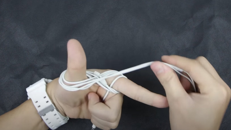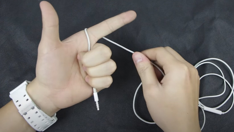 Bước 2: Dùng ngón trỏ và ngón út làm giá đỡ, ngón cái cố định phần dây tai nghe