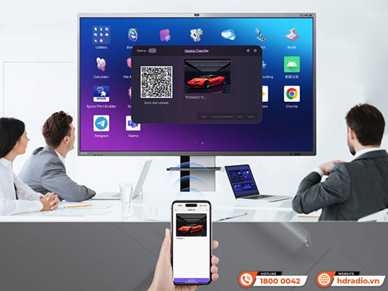 Quét mã QR bằng điện thoại để dễ dàng tải hình ảnh, video và tài liệu từ điện thoại lên màn hình phẳng tương tác, giúp việc chia sẻ ổn định và nhanh chóng.