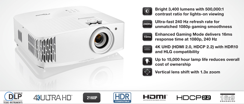 Optoma UHD50X là một dòng máy chiếu mới với độ phân giải Ultra HD 4K cho bạn chi tiết gấp bốn lần so với máy chiếu full HD. Điều này mang đến một hình ảnh rõ nét hơn hoàn hảo cho thế hệ máy chơi game mới và đĩa 4K. Với bánh xe 8 màu mới, máy chiếu 4k Optoma UHD50X tạo ra màu REC.709 đáng kinh ngạc nhưng vẫn có thể phát ra độ sáng 3400 lumens rực rỡ để giải trí trong phòng. Máy chiếu này tương thích với tiêu chuẩn HDR10 mới cho dải động cao hơn trong hình ảnh tạo ra màu trắng sáng và bóng tối sâu hơn trên màn hình cùng một lúc. Nó chiếu các mức độ đen sâu với độ tương phản 500.000: 1 khổng lồ và tạo ra hình ảnh 4K UHD rõ nét.