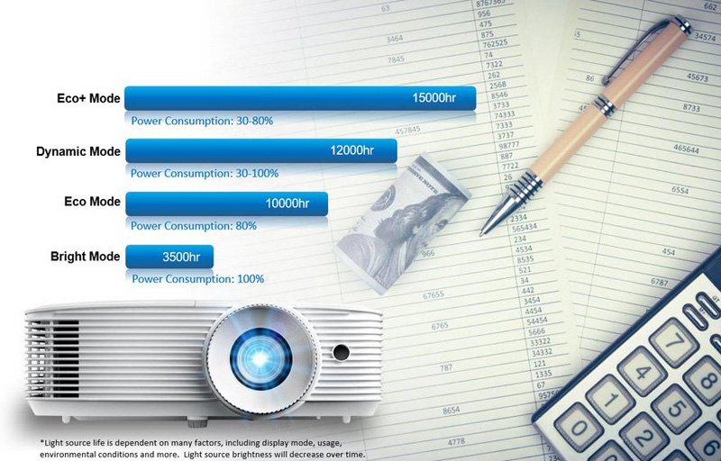 Lưu ý nếu bạn muốn máy lâu phải thay bóng đèn hơn có thể giảm xuống chế độ Dyamic hoặc Eco+ độ sáng chỉ còn 2200 lumens và 1999 lumens độ sáng, tương ứng độ bền bóng chiếu sẽ tăng lên 12.000 giờ và 15.000 giờ sử dụng.