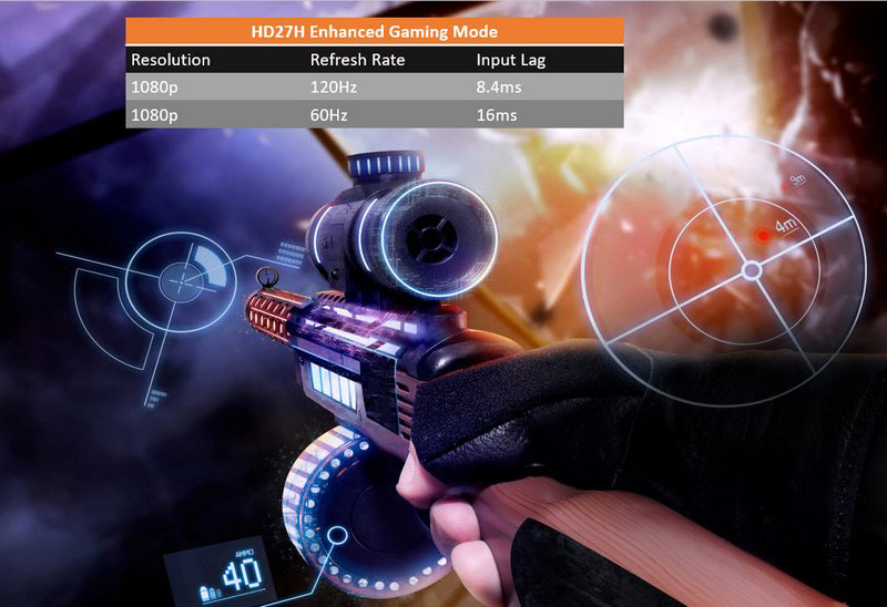 Hơn thến, bạn có thể giành chiến thắng trong game nhanh, dễ dàng hơn một phần nghìn giây với Máy chiếu Optoma HT27LV, bởi nó là máy chiếu duy nhất tạo ra tới 120 khung hình mỗi giây và thời gian đáp ứng chỉ 8.4ms, mang đến cho bạn hình ảnh sống động nhất cho thú vui giải trí đỉnh cao của bạn.