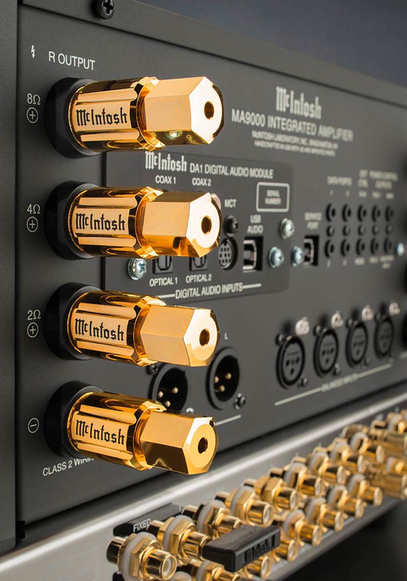 Amply McIntosh có các cọc loa mạ vàng chất lượng công nghệ Solid Cinch ™ giúp gắn chắc chắn dây loa tvới amply, tránh bị lỏng và có thể gây chập điện; các cột liên kết cũng được mạ vàng để chống ăn mòn và đảm bảo tín hiệu chất lượng được gửi qua cáp loa đến loa Hi-End của bạn.