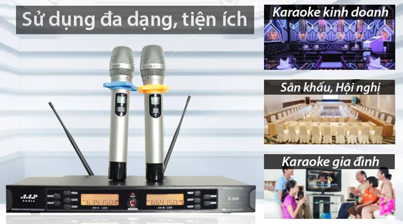 Micro AAP K500 là sản phẩm micro karaoke không dây mới mẻ, thông minh đến từ thương hiệu AAP. Với thiết kế đẹp mắt cùng nhiều tính năng nổi trội, chống hú cực tốt, AAP K500 không chỉ phù hợp với các không gian karaoke gia đình, karaoke kinh doanh mà còn là lựa chọn hợp lý cho các nhu cầu về giảng dạy, hội họp, biểu diễn, kịch nói…