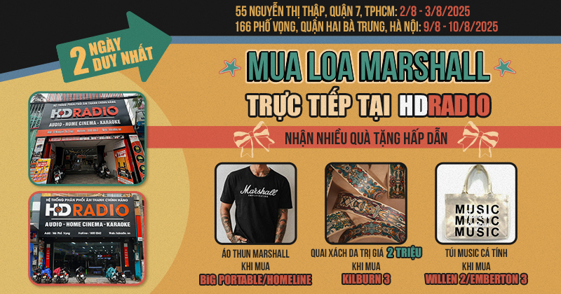 Đây rồi, các fan Marshall tại Hà Nội cũng không cần phải chờ đợi quá lâu. Từ ngày 9/8 - 10/8/2025 tại showroom HDRadio Phố Vọng bạn cũng sẽ được trải nghiệm 2 mẫu loa Marshall vừa được ra mắt gần đây đó là Kilburn 3 và Middleton 2. Ngoài ra, quý khách hàng cũng sẽ được nghe trực tiếp chất âm của các sản phẩm thương hiệu Marshall và đặc biệt là cũng sẽ được nhận những phần quà vô cùng hấp dẫn lên đến 2.000.000đ khi mua hàng trực tiếp tại cửa hàng.