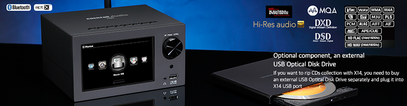 - Chức năng tùy chọn, sao chép đĩa CD với siêu dữ liệu CD Gracenote và ảnh bìa album: Nếu bạn muốn trích xuất bộ sưu tập CD của mình sang X14 MusicDB, bạn cần phải mua một ổ đĩa quang USB bên ngoài và cắm nó vào cổng máy chủ USB X14. Bạn có thể tải tất cả các đĩa CD của mình lên MusicDB của X14 ở định dạng tệp FLAC, ALAC, WAV hoặc MP3 một cách dễ dàng