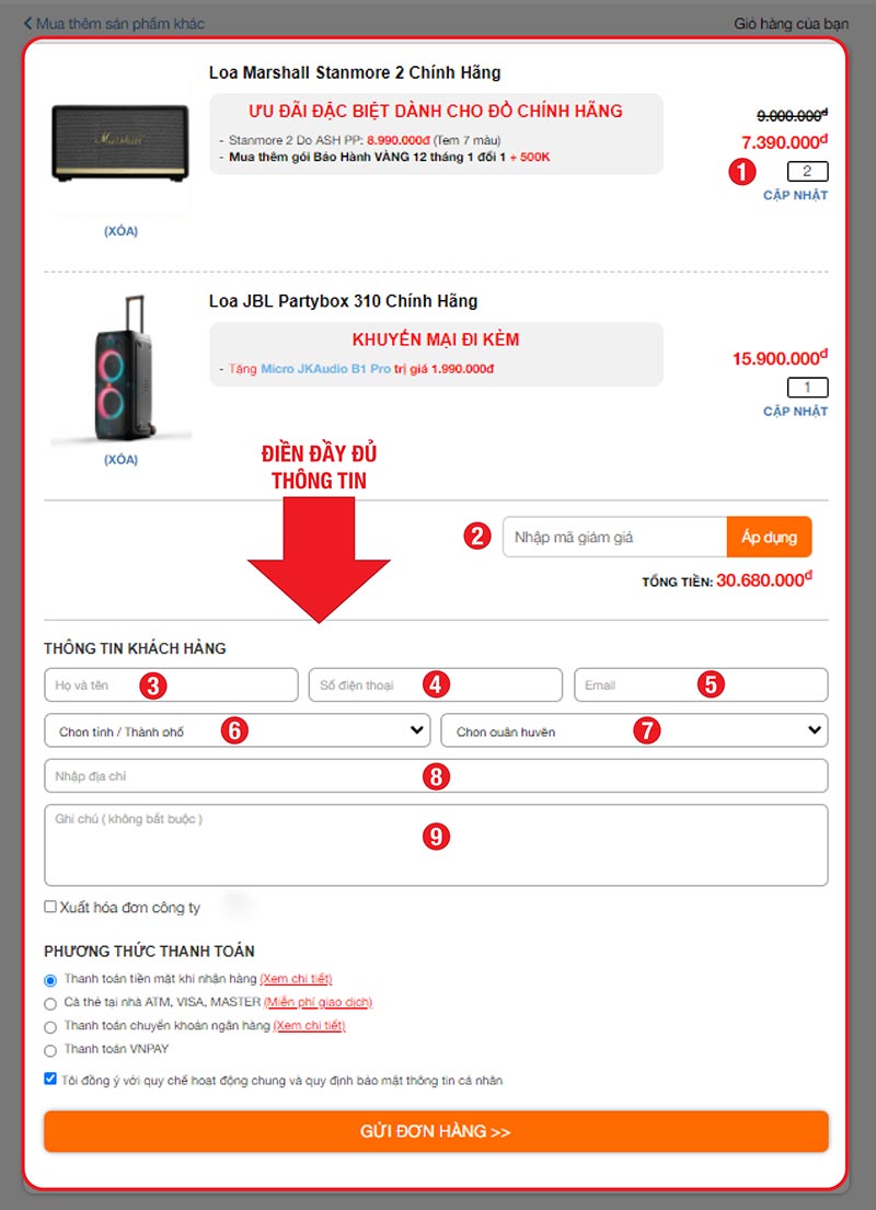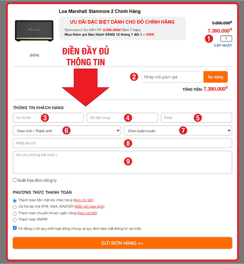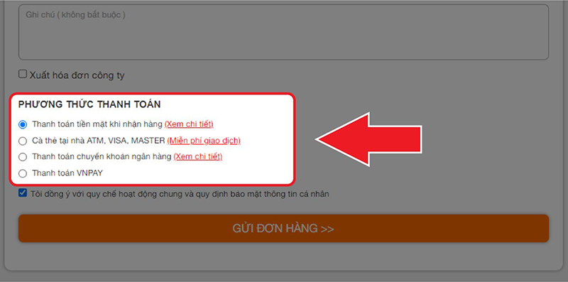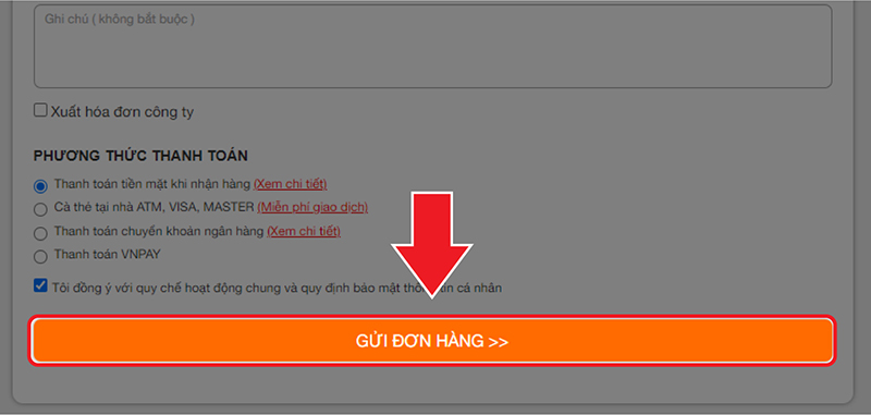Sau khi bạn đã điền đầy đủ thông tin, và chọn phương thức thanh toán nhấn GỬI ĐƠN HÀNG >> để hoàn thành.