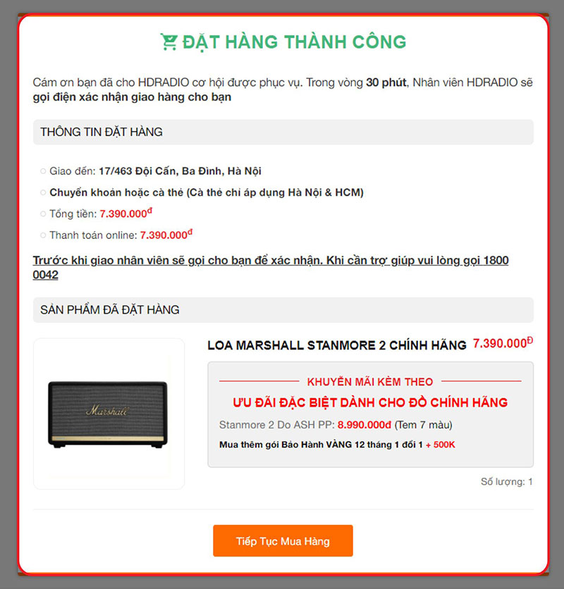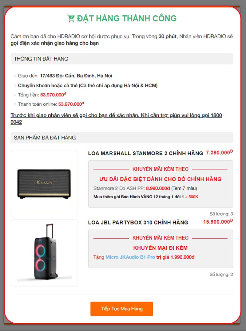Sau đó HDRADIO sẽ gửi đến bạn một thông báo đặt hàng thành công.