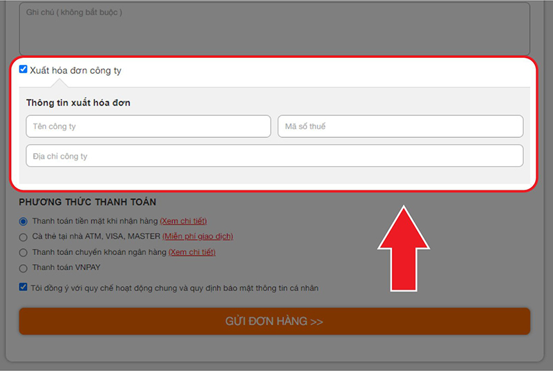 Nếu bạn muốn Xuất hóa đơn vui lòng tích chọn "Xuất hóa đơn công ty" sau đó điền đầy đủ thông tin bao gồm: Tên công ty, mã số thuế và địa chỉ công ty.