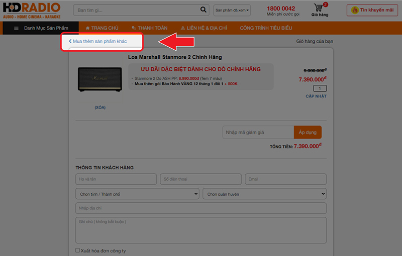 Ngoài ra, bạn cũng có thể nhấn "Tiếp Tục Mua Hàng" để quay về trang chủ và chọn mua các sản phẩm khác của HDRADIO