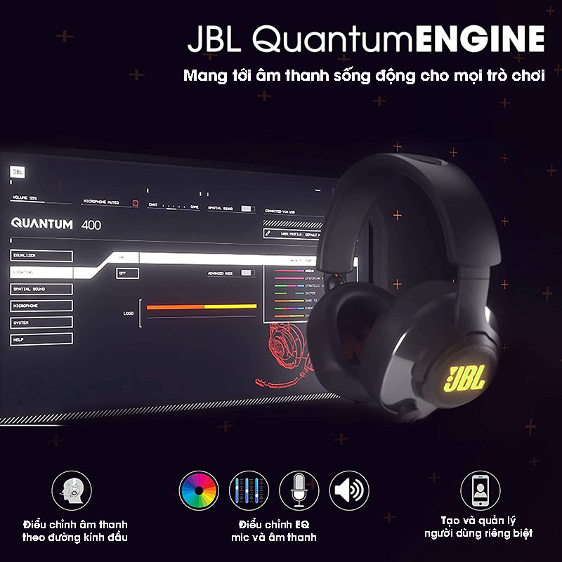 - Trang bị công nghệ JBL Quantum Sound Engine mang đến khả năng thể hiện hiệu ứng âm thanh 3D đa hướng.