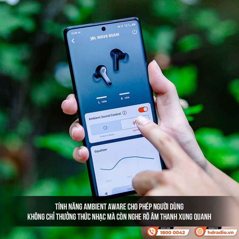 Ngoài ra, tai nghe JBL true wireless wave beam còn có tính năng Ambient Aware giúp bạn tiếp tục phát nhạc mà vẫn có thể nhận biết âm thanh từ môi trường xung quanh. Điều này cho phép bạn thưởng thức âm nhạc mà vẫn không bỏ lỡ những âm thanh quan trọng từ xung quanh.