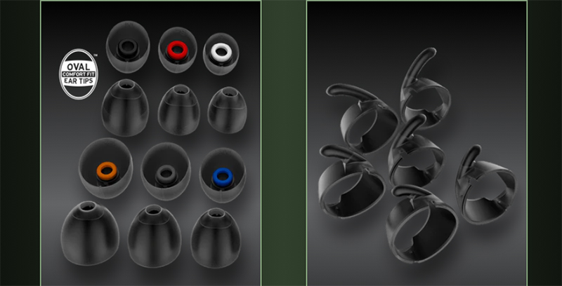Ngoài ra còn có các ear tip bằng bọt có định hình nhằm tạo ra một hình dáng vừa khít từng tai người đeo, giảm áp lực và 3 kích cỡ của cánh tai bằng cao su để giữ tai nghe không bị rơi ra ngoài.