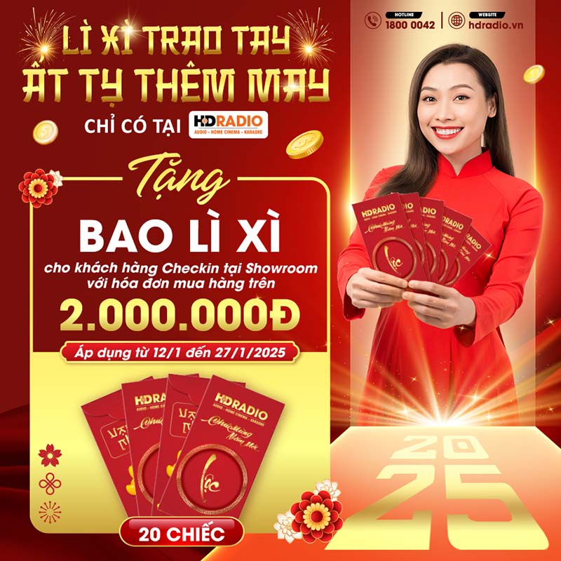 Bên cạnh những chương trình ưu đãi lớn, khi Checkin tại Showroom với hoá đơn mua hàng trên 2.000.000đ HDRadio tặng bạn bộ 20 chiếc lì xì độc quyền xinh xắn nhân dịp Xuân về. Chương trình áp dụng với mỗi hoá đơn mua hàng trên 2.000.000đ và chụp ảnh checkin tại Showroom, bạn sẽ được tặng ngay bộ 20 chiếc lì xì độc quyền đang áp dụng tại các Showroom HDRadio trên toàn quốc từ 12/1 đến 27/1/2025. Hãy ghé ngay HDRadio để thưởng thức âm thanh, chọn mua và rinh ngay bộ lì xì này nha vì số lượng rất có hạn ạ!!!