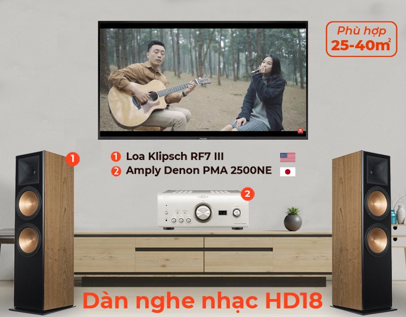 Dàn nghe nhạc Klipsch, Denon HD18 là một trong những bộ dàn nghe nhạc cao cấp bán chạy nhất tại HDRadio, phối hợp ăn ý giữa Amply Denon PMA 2500NE (Xuất Xứ Nhật Bản) với cặp Loa Klipsch RF7 III, cho khả năng thể hiện hoàn hảo tất cả các thể loại nhạc từ trữ tình đến nhạc bolero hay nhạc vàng .trong khoảng không gian từ 25 - 40 mét vuông.