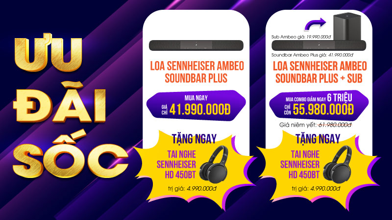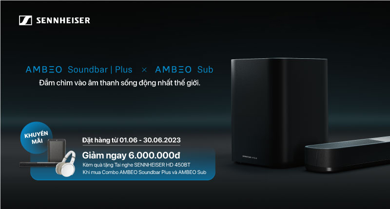 • Đặc biệt, khi mua combo cả loa soundbar Sennheiser Ambeo Plus và loa sub Sennheiser Ambeo quý khách hàng còn được GIẢM GIÁ lên đến 6.000.000đ giá chỉ còn 55.980.000đ và còn được tặng tai nghe Sennheiser HD 450BT trị giá 4.990.000đ.