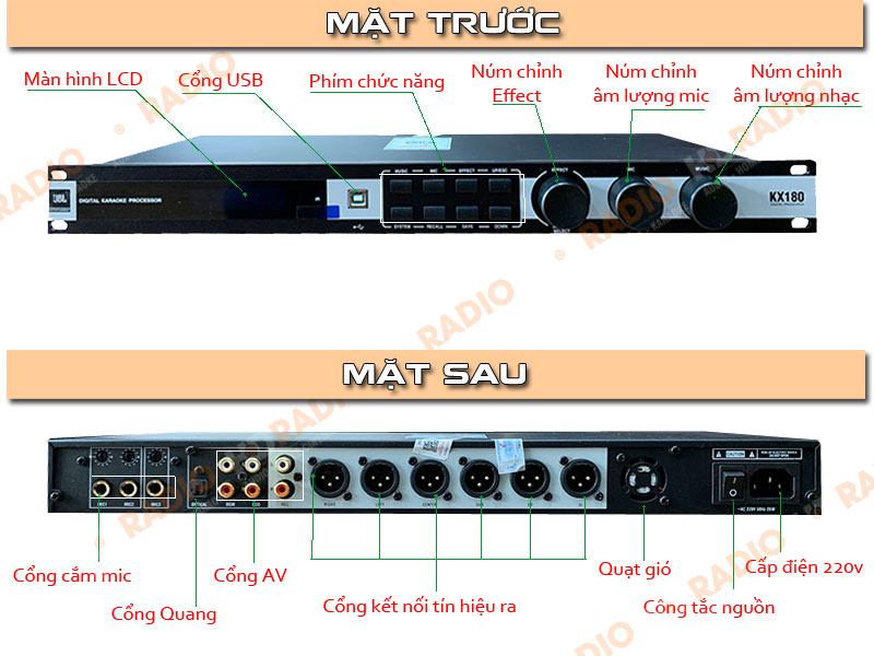Cận cảnh mặt trước và mặt sau của vang số JBL KX180A