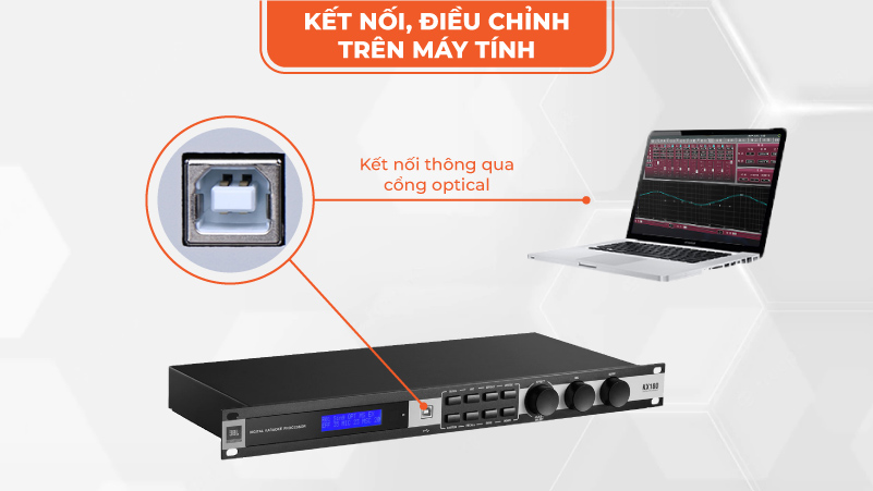 Kết nối USB 2.0 phía trước máy thuận tiện kết nối máy tính cân chỉnh, dễ dàng điều chỉnh Echo và Reverb cho mixer karaoke JBL KX180 thông qua phần mềm hãng cung cấp kèm theo.